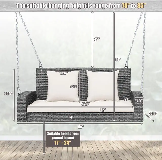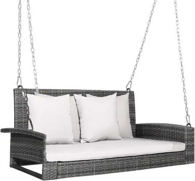All-weather PE Rattan: Different from other wooden swing chairs, this swing bench is constructed of weather resistant mix grey PE rattan to withstand outdoor changing weather. Furthermore, the reinforced structure ensures the stability of the overall framework. Hence, you can hang this safe and sturdy swing chair bench on the porch, garden and backyard, etc.