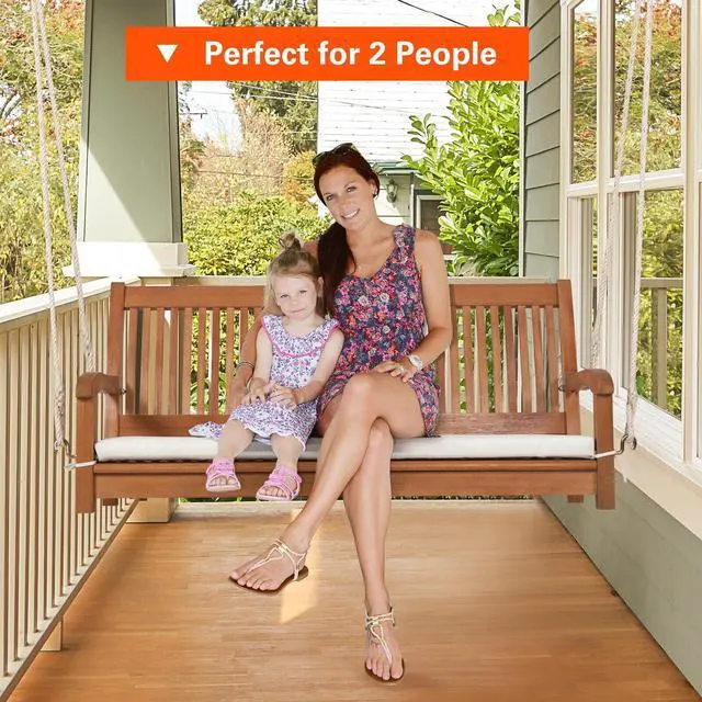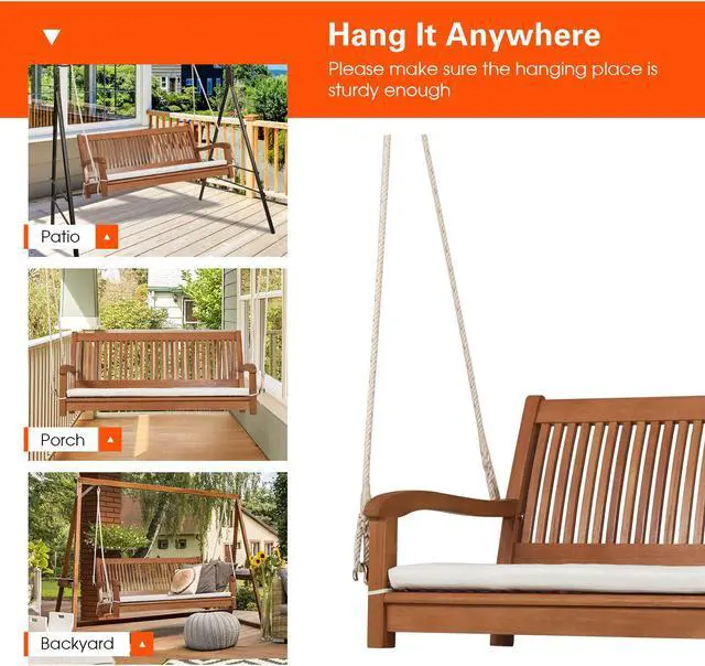 Hang It Anywhere: The clean lines and unique slat design make this 2-person hanging swing bench a perfect decoration for your patio, porch, backyard, poolside and so on. Read your favorite books or have a pleasant conversation time on this comfortable hanging swing bench.