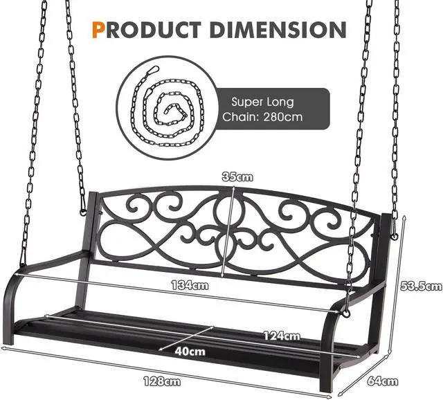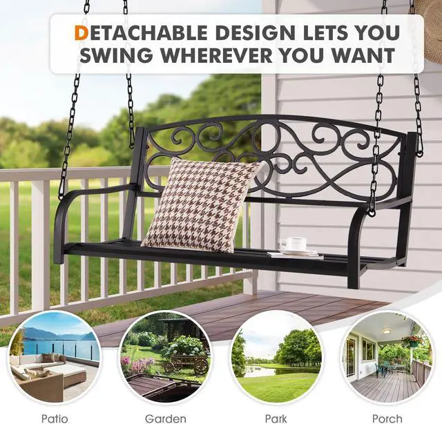 Multiple Hanging Places: The swing bench is equipped with 2 metal chains, each of which is 110 long, much longer than the others. Therefore, you can hang the porch swing in multiple places at your wanted height. And you can swing anywhere you want, such as on the front porch, park, balcony and backyard.