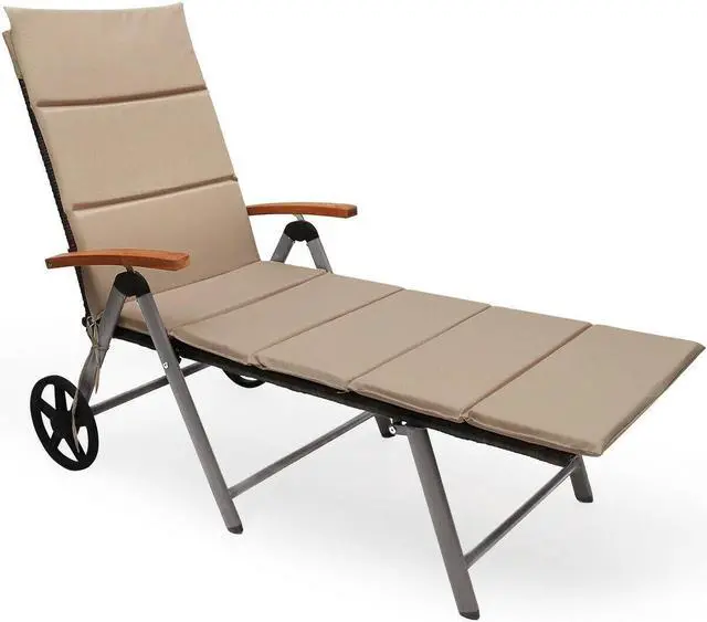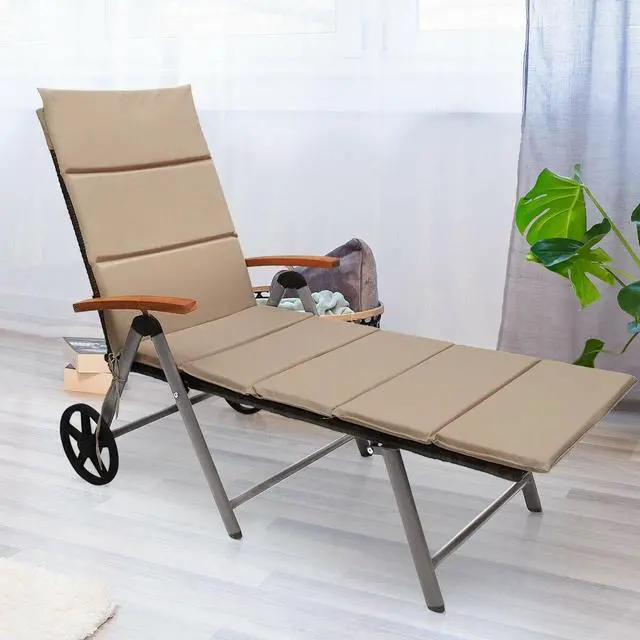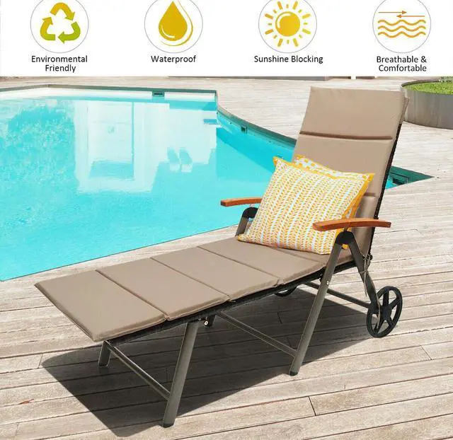 Adjustable Backrest and Removable Wheels: This patio chaise lounge chair can be adjusted to satisfy your different needs, featuring its seven back tilting positions. With two flexible wheels on both sides, the patio chaise lounge chair can be easily moved from patio to garden as you like, reducing a little bulkiness.