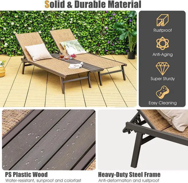 Built-to-Last Material: The chaise lounge also features high-grade seat fabric which is not only breathable and quick to dry but also wearable and tear-resistant. Furthermore, the middle panel is made of PS plastic wood, which is water-resistant, sunproof and colorfast, ensuring long-time outdoor use. Plus, the solid middle panel can load up to 110 lbs.