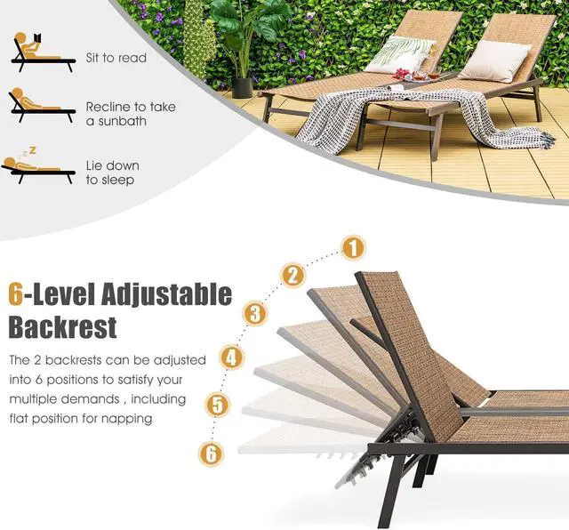6-Level Adjustable Backrest: The backrest of each seat can be independently adjusted into 6 different positions including the flat position. Thus, whether you want to sit to read, recline to take a sunbath or lie flat to sleep, this 2-person chaise lounge will always satisfy your demands for outdoor relaxation.