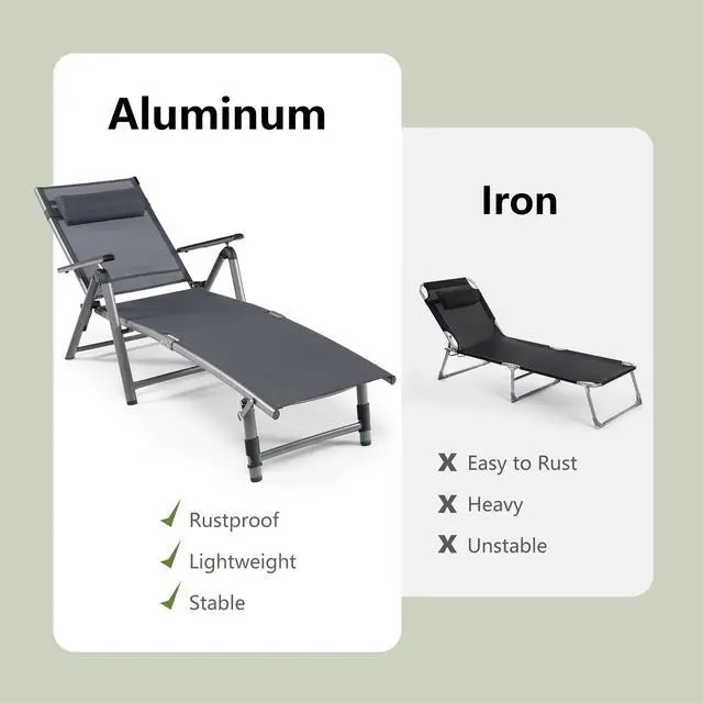 Folding and Portable Design: The foldable design makes this patio chaise lounge convenient to store, greatly saving your home space no matter indoors or outdoors. Moreover, the lightweight aluminum frame allows you to carry this outdoor recliner to the patio, poolside or backyard effortlessly.