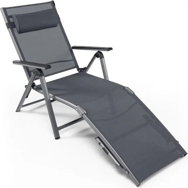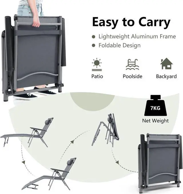 No Installation Required: This outdoor aluminum chaise lounge chair is not needed to assemble, which greatly saves your precious time and energy. Overall dimension of unfolding: 71"/68.5"/66"/64.5"/62.5"/59"/57"/53.5" x 26.5" x 27.5"/29"/31"/33"/34.5"/36"/37"/37.5" (L x W x H), overall dimension of folding: 29" x 26.5" x 7.5" (L x W x H). Please refer to the size instructions before purchasing to avoid unnecessary trouble.