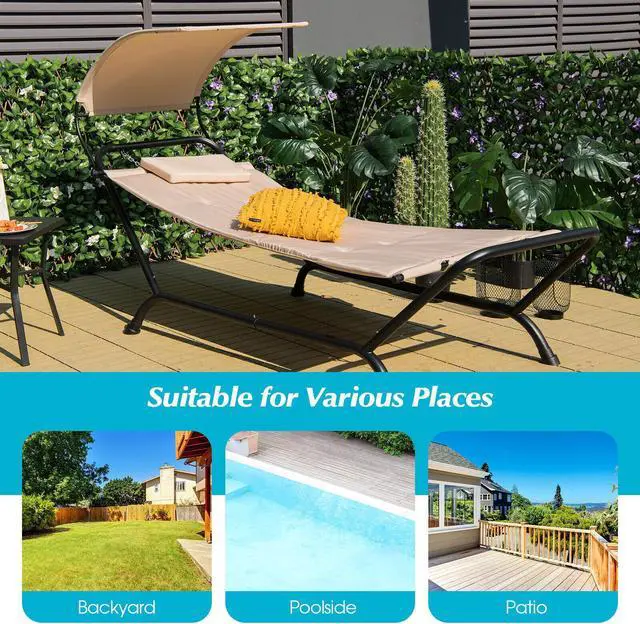 Wide Range of Application: This freestanding hammock with stand and a removable canopy is suitable for various places, like the backyard, poolside, patio, garden, porch, deck, balcony, or indoor space. You sit or lie in it to completely relax your body and mind in the cool breeze.
