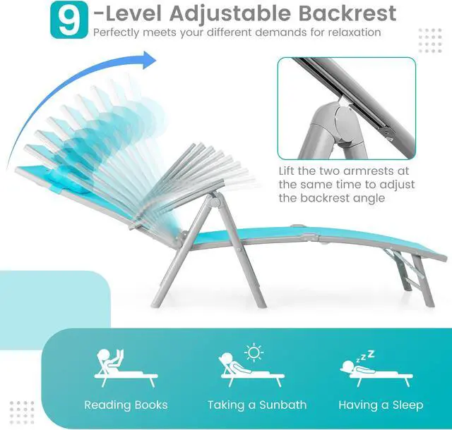 9-Level Adjustable Backrest: The backrest of the chaise lounge features 9-level adjustment, which perfectly meets your different demands for relaxation. And the operation is quite simple, you just need to lift the two armrests at the same time to adjust the backrest angle.