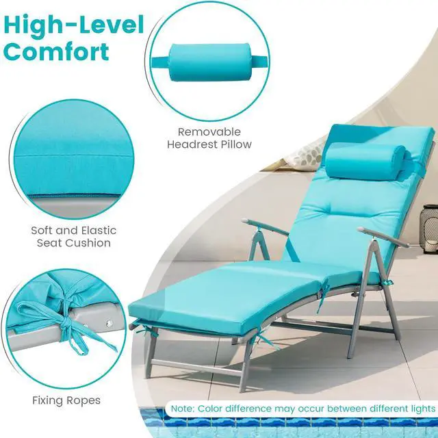 No Assembly Needs: This patio chaise lounge requires no assembly. You can attach the headrest pillow with the elastic band, and long seat cushion with fixing ropes. Furthermore, the recliner is ideal for indoor and outdoor places like backyard, poolside and living room.