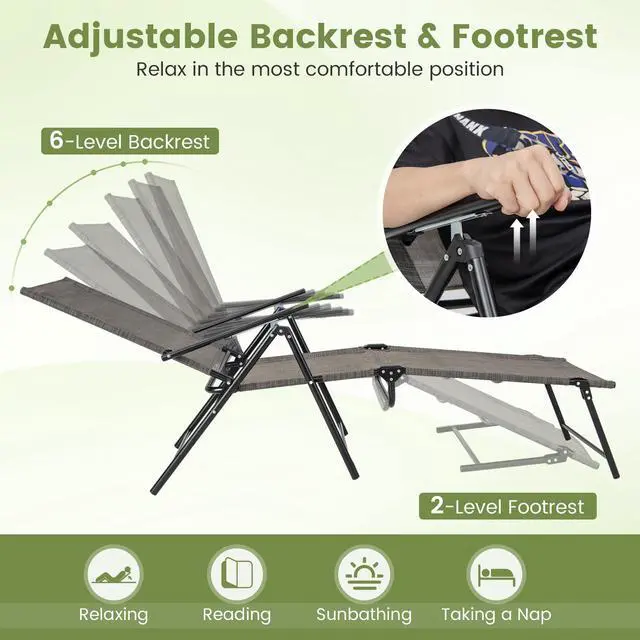 Adjustable Backrest and Footrest: 6-level backrest and 2-level footrest allow you to relax in the most comfortable position. Whether for relaxing, reading, sunbathing or taking a nap, these 2 patio recliners will always be a nice choice.