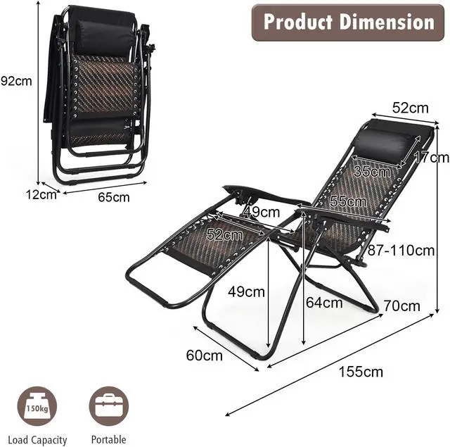 Foldable Design for Convenient: Thsi rattan zero gravity chair can be folded into a compact size when not in use, which occupies little space of your home. Because of the lightweight design, it is convenient for you to put this lounge chair to the trunk when you go out to enjoy leisure time with your family members.