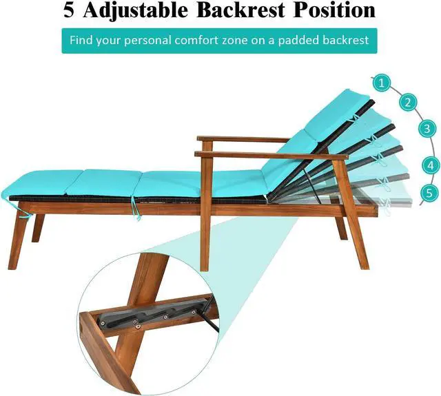 Sturdy Real Wood Structure: The adjustable chaise lounge chairs are made with durable acacia wood frame and wrapped around with sun-resistant rattan for added strength and durability. This patio chaise can well stand for the test of time and high temperature and will bear weight up to 600lbs.