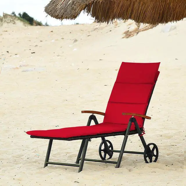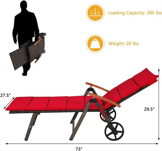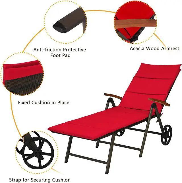 Adjustable Backrest and Removable Wheels: This patio chaise lounge chair can be adjusted to satisfy your different needs, featuring its seven back tilting positions. With two flexible wheels on both sides, the patio chaise lounge chair can be easily moved from patio to garden as you like, reducing a little bulkiness.