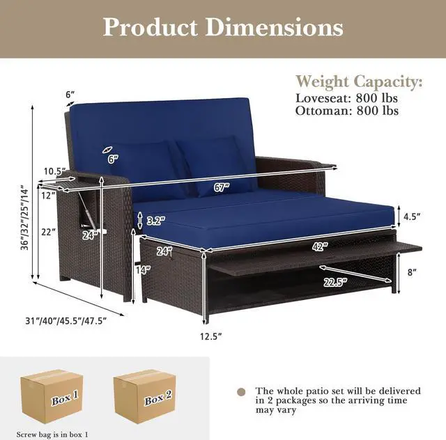 2-Package Delivery: This patio rattan daybed set will be delivered in 2 packages which may arrive in different times, so please wait with patience. And the screw bag for the whole set is box 1. What's more, the assembly is quite easy with the clear instruction. Dimension of loveseat: 31"/40"/45.5"/47.5" x 67" x 36"/32"/25"/14" (L x W x H). Dimension of ottoman: 43.5" x 24" x 12.5" (L x W x H).
