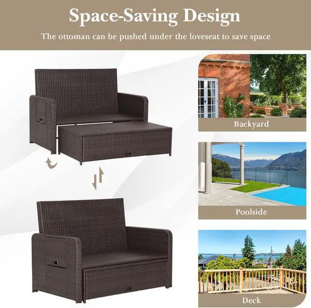 Space-Saving Design: When not in use, the ottoman can be pushed under the love seat to save space, leaving more room for other activities. Designed with elegant rattan surface, this patio sofa set will be a decorative addition to various occasions, such as backyard, poolside and deck.