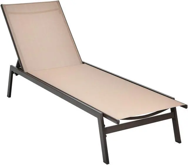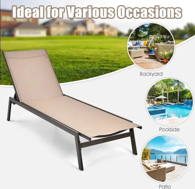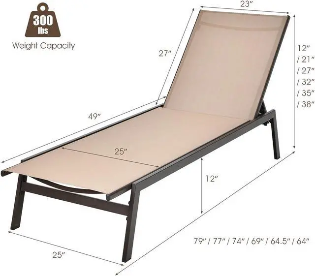 Instruction Description: Enjoy the beautiful sunset with this outdoor chaise lounge chair!  To meet your different needs; there are 6 adjustable backrest positions for you to choose from. You can sit up or lie flat for reading or resting. When you lie on this outdoor lounger the sturdy steel frame can hold you safely and the durable fabric offers a breathable using experience. Likewise the frame is anti-rust and the fabric is fast-drying which makes this chaise lounge chair perfect for outside.  If you are looking for an outdoor chaise lounge chair like this do not hesitate to place an order!  Satisfies your various demands thanks to its 6-position adjustable backrest Breathable fabric for comfortable lying experience Holds up to 330 lbs with sturdy steel frame Anti-slip foot pads for extra stability Rustproof frame and quick-drying fabric for outdoors Suitable for patio garden backyard and poolside etc Convenient to assemble for saving your time
