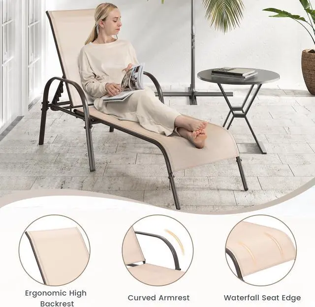 Instruction Description: Don't leave the lounge chairs outside in rainy days for prolonging its' using life Made of Sun-proof and breathable fabric for long-lasting use Powder-coated steel frame provides sturdy support Thick legs and anti-slip pads provide extra stability 5 adjustable backrest positions to meet your various needs Ideal for your patio poolside backyard balcony and more Lightweight and easy to transport Smooth curved armrests for greater comfort Easy to assemble and maintain Installation guide