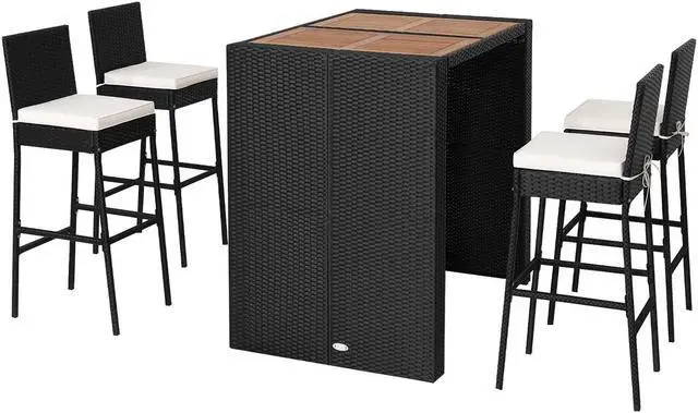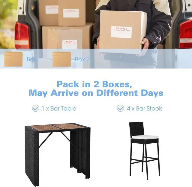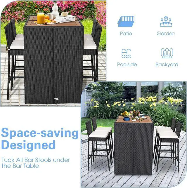 Space-saving 5-piece Set: This 5-piece patio bar set includes 1 bar table and 4 bar stools that are perfect for gatherings on the patio, garden, poolside or backyard, tasting wine together. After finishing outdoor activities, you can tuck all bar stools under the bar table to save your outdoor space.