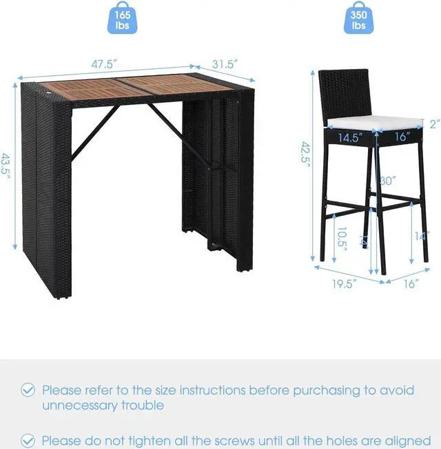 Product Dimension: Dimension of table: 47.5'' x 31.5" x 43.5" (L x W x H), overall dimension of each bar stool: 19.5" x 16" x 42.5" (L x W x H). Please refer to the size instructions before purchase to avoid unnecessary trouble.