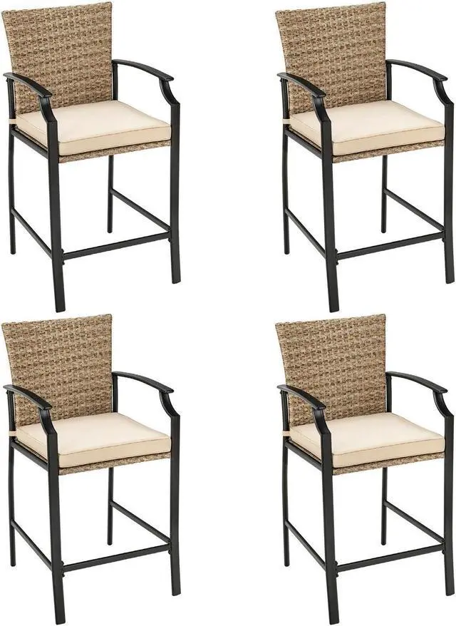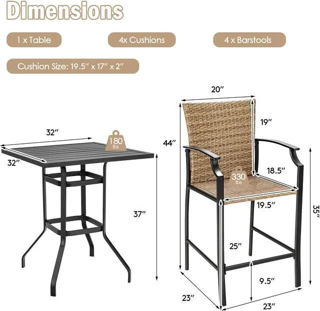 Exquisite 5 Pieces Patio Bar Set: Including 4 rattan bar stools and 1 bar table, this product can meet your various outdoor leisure demands. Whether in the poolside, garden or courtyard, this outdoor dining table and chair set will always provide you with an exquisite gathering or dining space