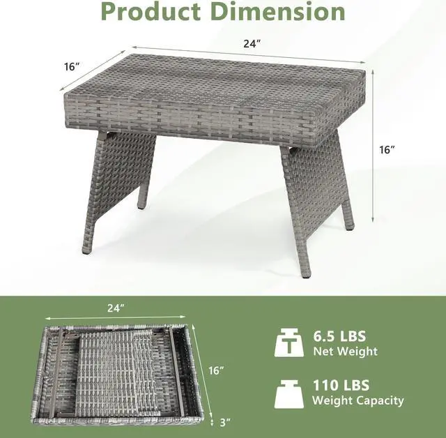 Installation and Size: The fordable wicker table is no need to assemble. Opening size: 23.6"x15.7"x15.7"(L X W X H), Folding size: 23.6"x15.7"x3.1"(L X W X H), Product weight: 9.2lbs