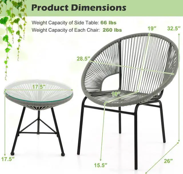 Dimension and Easy Assembly: This 3-pc outdoor furniture set includes two chairs measuring 28.5" x 26" x 32.5" each and a table measuring 17.5" x 17.5" x 17.5". According to the detailed installation manual included, you can easily finish the assembly of this set of 3 patio furniture set and start enjoying outdoor leisure time.