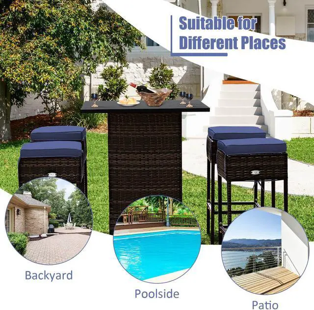 5-Piece Outdoor Furniture Set: Coming with a bar table and 4 ergonomic stools with appropriate height, this 5-piece rattan bar set not only makes outdoor life more comfortable but adds a great addition to different places, such as poolside, garden and backyard, etc.