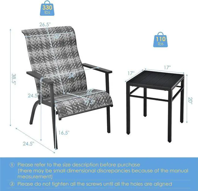 Efficient Assembly: The package includes all necessary hardware and clear instruction for quick assembly. Please do not tighten all the screws until all the holes are aligned. Dimension of table: 17" x 17" x 20" (L x W x H), overall dimension of each chair: 24.5" x 24" x 38.5" (L x W x H). Please refer to the size description before purchase (there may be small dimensional discrepancies because of the manual measurement).