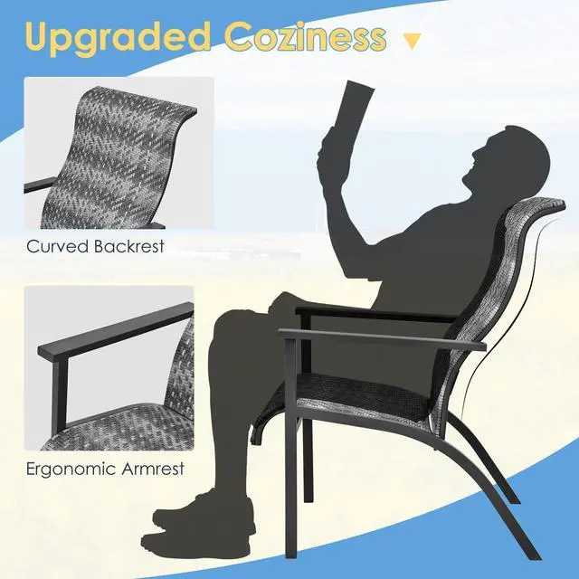 Upgraded Coziness: The patio chairs feature curved backrests and ergonomic armrests, which provide a more comfortable sitting experience to enjoy leisure time completely. And the high backrests also bring full back support. Moreover, the sturdy back support and anti-slip foot pads ensure great stability while sitting.
