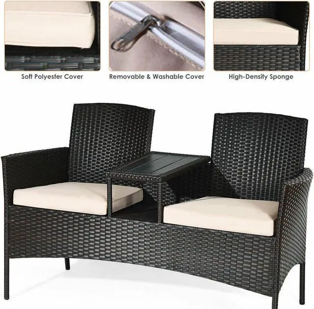 Wide Applications of Unique Style: This outdoor loveseat sofa set in modern and chic style is great for patio, porch, backyard, balcony and poolside. Besides, with built-in coffee table between 2 seats, this patio loveseat sofa is compact and great for small space.