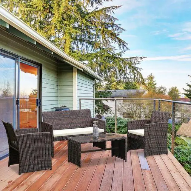 Stylish and Functional Design: This 4-piece brown rattan furniture set, including 1 loveseat, 2 single sofas, and 1 glass-top coffee table, enhances your outdoor space with a modern and fashionable touch.