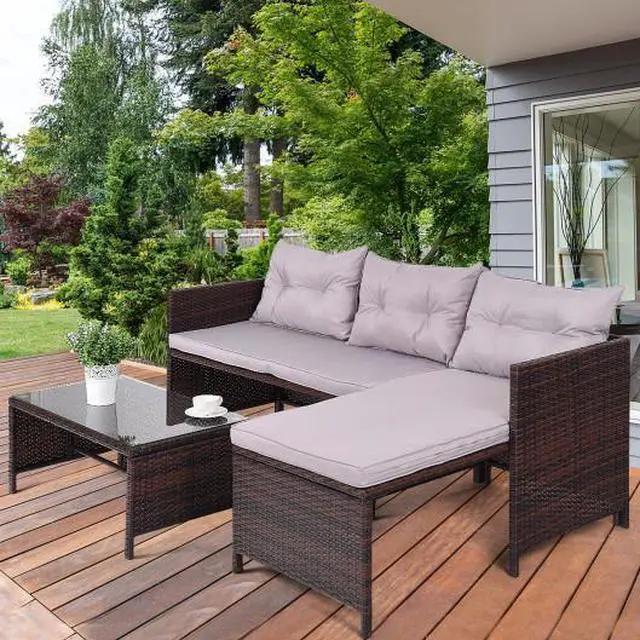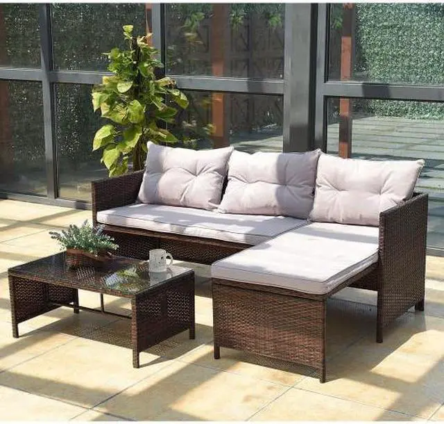 Stylish 3-Piece Rattan Furniture Set: Enhance your outdoor living space with this modern rattan sofa set, which includes a sofa, chaise lounge, and coffee table, perfect for patios, poolside, decks, or gardens.
