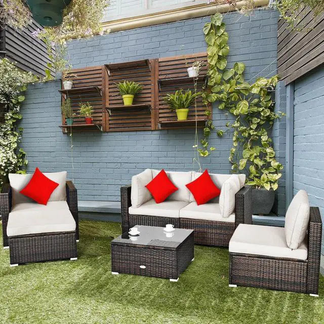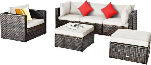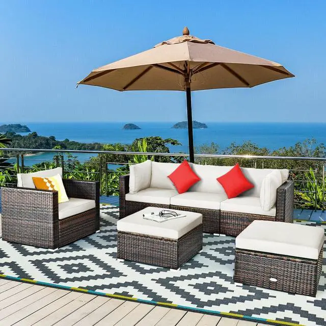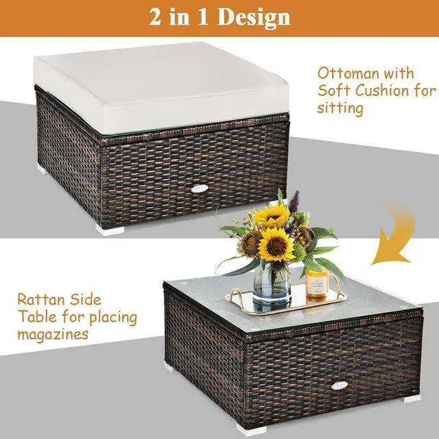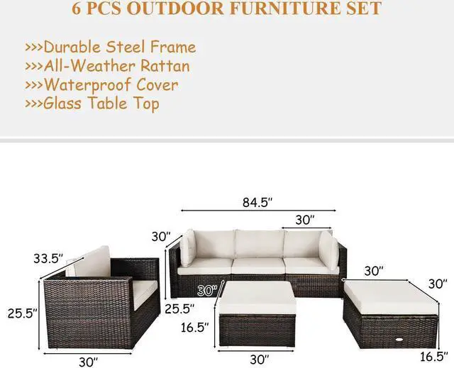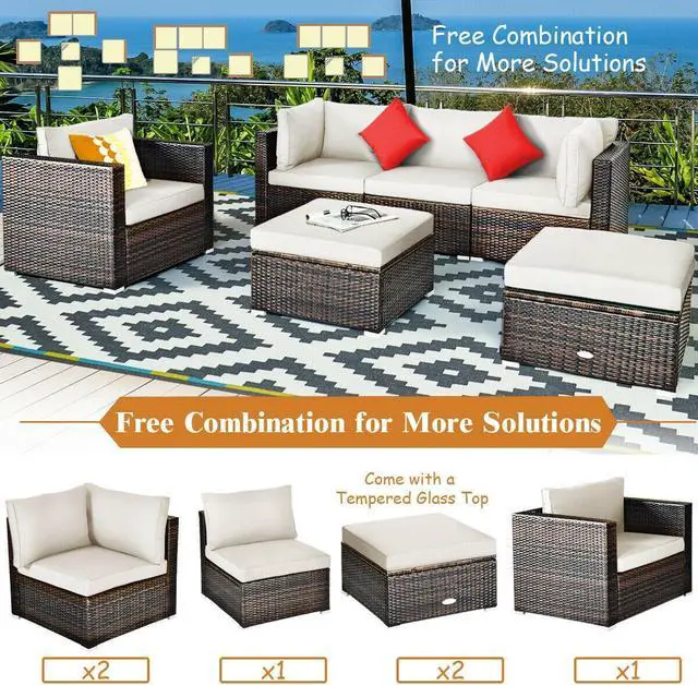 Flexible Combination and Free Conversion: This 6-piece patio furniture comes with 2 corner sofas, 1 arm less sofa, 1 single sofa, and 2 ottomans. Removing the cushion, this ottoman can be changed to a glass coffee table because of an included tempered glass top. Each piece of this sofa set can be used separately or easily combined.