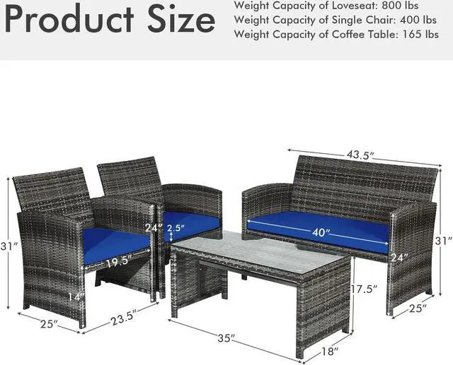 Dimension of the Patio Set: The single sofa dimension is 23.5" x25" x31"(L x W x H), size of double sofa: 43.5" x 25"x 31" (L x W x H) and size of coffee table: 35" x 18" x 17.5" (L x W x H). Benefit from quality materials and sturdy construction,the weight capacity of coffee table is 165 lbs, the weight capacity of single sofa is 400 lbs and the weight capacity of bench is 800 lbs.