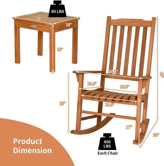 Selected Eucalyptus Material: Made of selected premium eucalyptus wood, this rocking chair set in adult size is stable and durable enough for long-term outdoor use. And the exquisite connection between panels is firmly fixed by the screws to ensure that it wont easily wobble or fall apart.