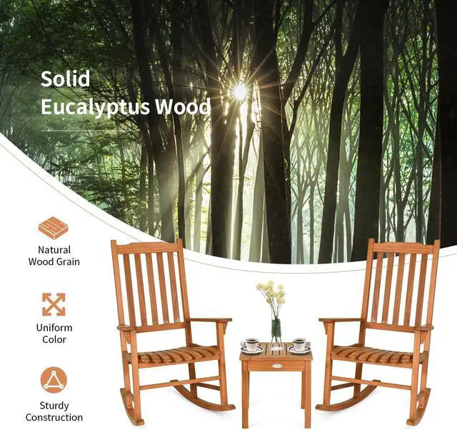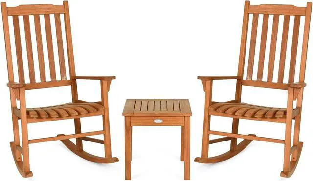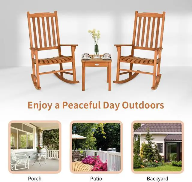 3 Piece Patio Furniture Set: This rocking chair set includes two wood rocking chairs and a coffee table, available for two people to relax and chat under the sunshine. It's easy to change the furniture layouts for an optimal new look to get the mood strikes, perfect for garden, poolside, courtyard, or city balcony.