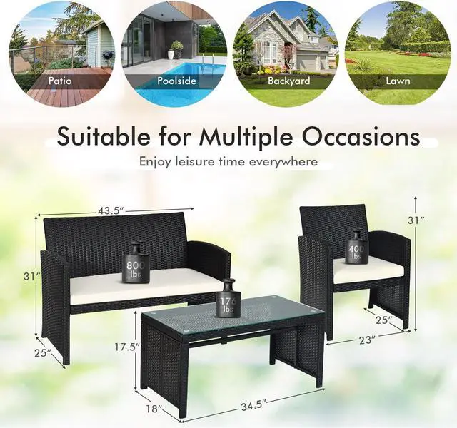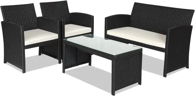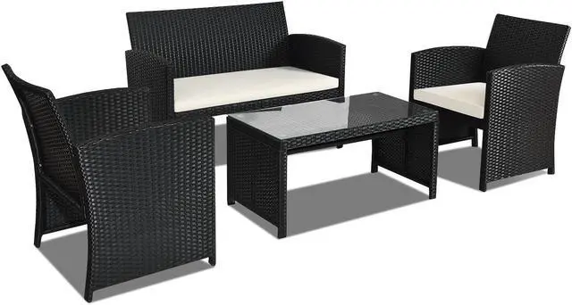Comfortable Patio Sofa Set: This conversation set with 1 loveseat, 2 single sofas, and 1 coffee table can perfectly satisfy the seating needs of a group of people. Our 4 Piece wicker set features comfortable cushions that are made of durable polyester fabric and a soft sponge. You and your family will enjoy your leisure time when a seat on the sofa.