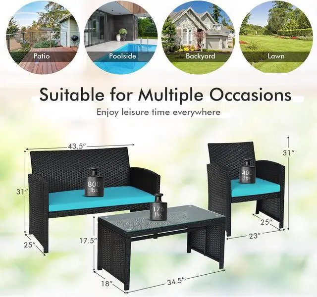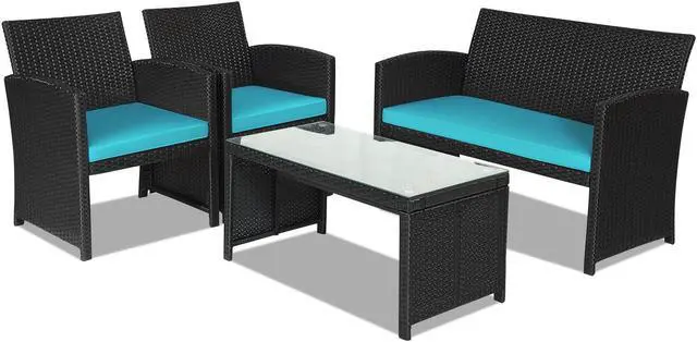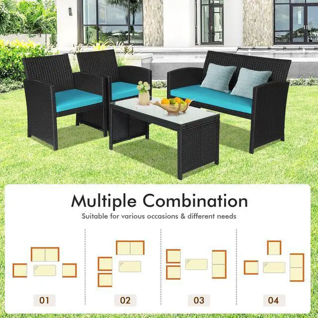Comfortable Patio Sofa Set: This conversation set with 1 loveseat, 2 single sofas, and 1 coffee table can perfectly satisfy the seating needs of a group of people. Our 4 Piece wicker set features comfortable cushions that are made of durable polyester fabric and a soft sponge. You and your family will enjoy your leisure time when a seat on the sofa.