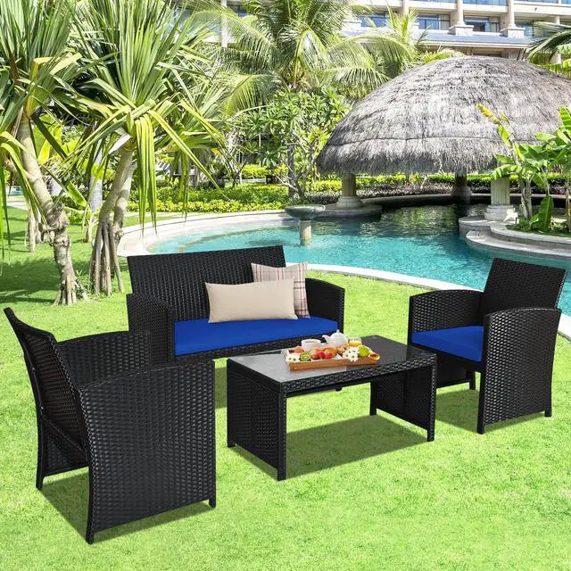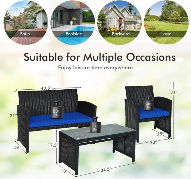 Comfortable Patio Sofa Set: This conversation set with 1 loveseat, 2 single sofas, and 1 coffee table can perfectly satisfy the seating needs of a group of people. Our 4 Piece wicker set features comfortable cushions that are made of durable polyester fabric and a soft sponge. You and your family will enjoy your leisure time when a seat on the sofa.