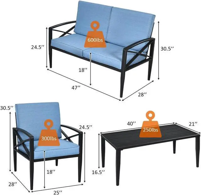 Easy Installation and Dimensions: It is convenient to assemble the set with instructions. Single sofa: 25" x 28" x 30.5"(L x W x H), weight capacity: 300lbs. Loveseat: 47" x 28" x 30.5"(L x W x H), weight capacity: 600lbs. Coffee table: 40" x 21" x 16.5"(L x W x H), weight capacity: 250lbs.