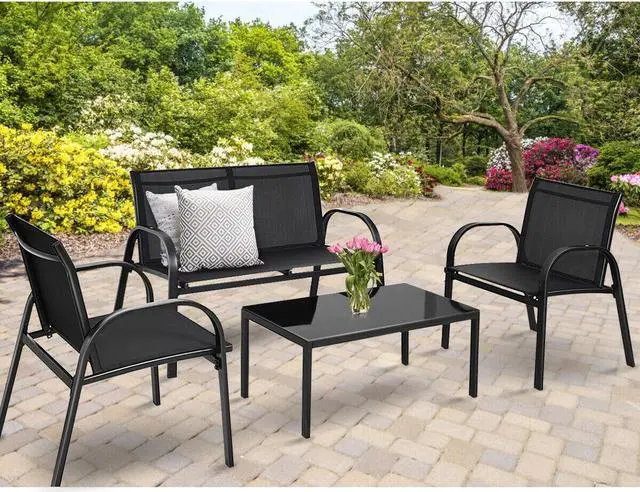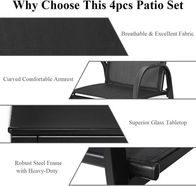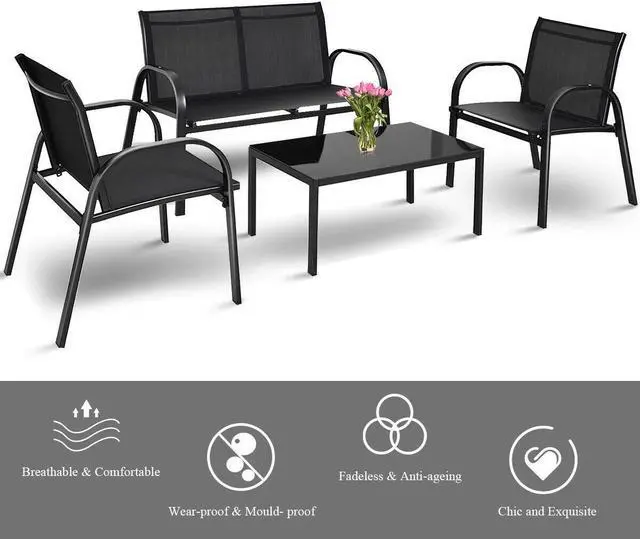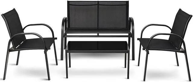 4 PCS Solid Patio Sofa: Equipped with 1 Loveseat, 2 chairs, and 1 coffee table, it is made up of solid steel frame and PVC fabric along with 1 glass top table. Its smooth armrests and moderate-reclining backrest double the comfort for you to totally relax.