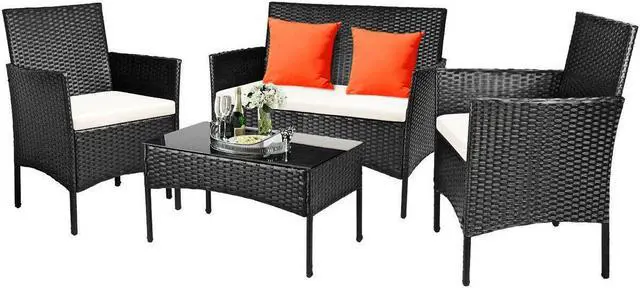 SlickBlue 4 Pieces Patio Rattan Cushioned Sofa Set with Tempered Glass Coffee Table