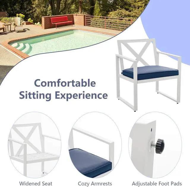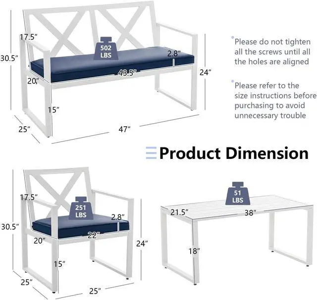 Sturdy Construction: Made of heavy-duty steel frame, the patio conversation set with reinforced structure ensures excellent sturdiness and strong support. And the power-coated surface is rustproof for outdoor use. Equipped with adjustable foot pads, the chair, loveseat and table fit well with uneven ground.