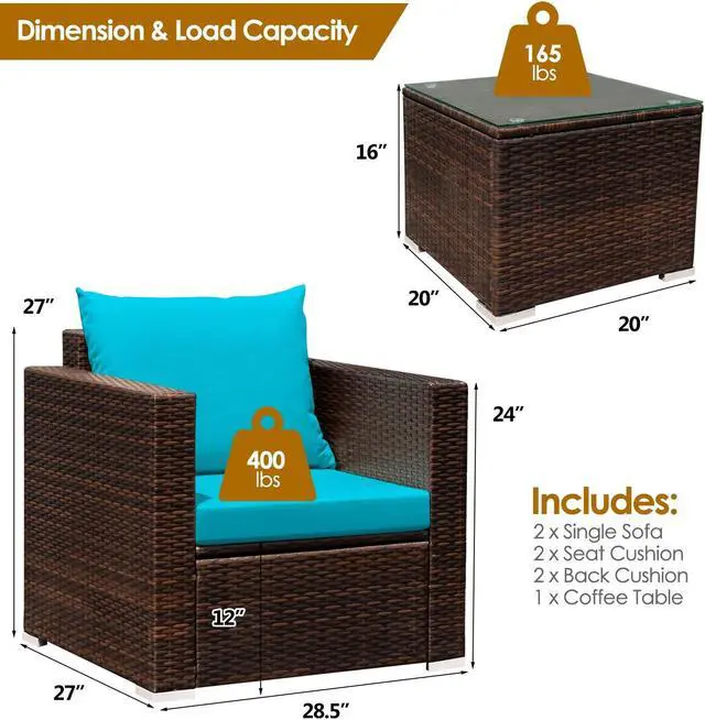 Versatile and Practical Sofa Set: Designed with concise and modern style, the set is great to be placed in your garden, patio, balcony, poolside, backyard, lawn. Dimension of single sofa: 28.5'' x 27'' x 27'' (L x W x H), hold up to 400 lbs. Dimension of coffee table: 20'' x 20'' x 16'' (L x W x H), hold up to 165 lbs.