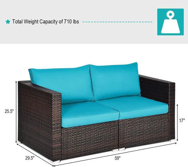 Easy to Assemble: According to the instruction, the rattan sofa set can be installed in short time. Dimension of one corner sofa is 29.5" x 29.5" x 25.5" (L x W x H). And the total weight capacity of the corner sofa set is about 710 lbs.