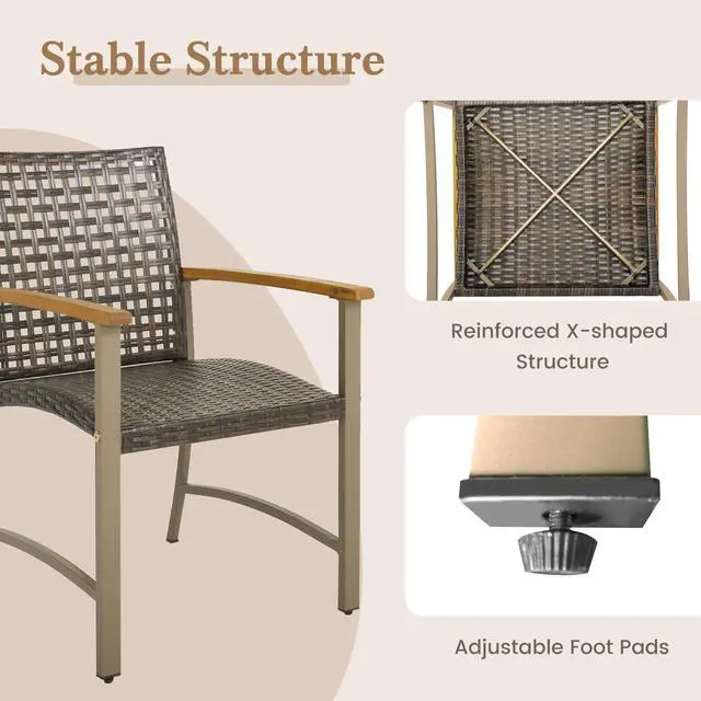 Cozy and Sturdy Chairs: Featuring ergonomic curved seat and acacia wood armrests, the chairs will offer you endless comfort. The well-woven rattan seat and back are also quite breathable to sit. Moreover, the adjustable footpads of front legs are designed for higher stability.