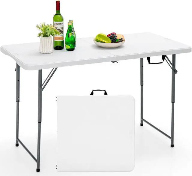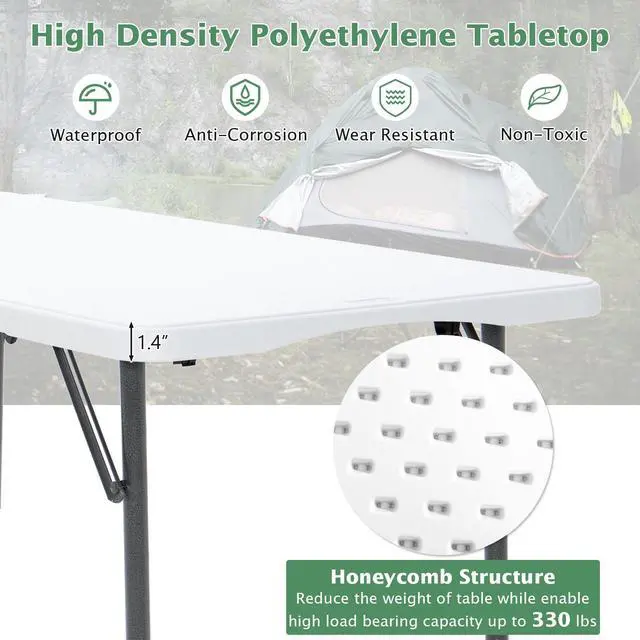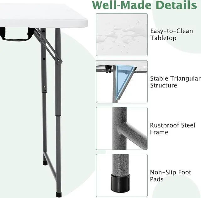 Convenient to Use and Maintain: Coming with an illustrated instruction, the folding table is easy to set up, adjust height and fold up in seconds. It doesn't require any difficult assembly process at all. In addition, the stain-resistant and waterproof HDPE tabletop makes cleaning a breeze.