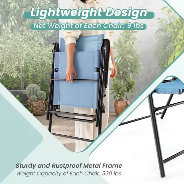 Folding and Portable Design: The locking devices allow you to unlock them for easy folding so that you can store these sling chairs for space-saving. And the lightweight design facilitates you to carry them with ease. Net weight of each chair: 9 lbs.