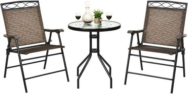 3 Pcs Bistro Conversation Set: A comfortable relaxing area is made up with 2 folding chairs and a round tempered glass table to conduct a private conversation or have dinner with best friends. It's easy to change your outdoor furniture layouts for an optimal new look to get the mood strikes. Perfect for your living room, backyard, beside pool or garden.