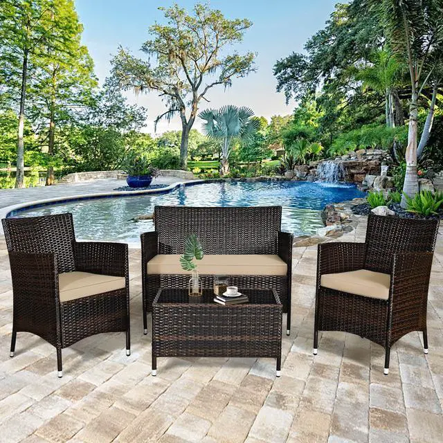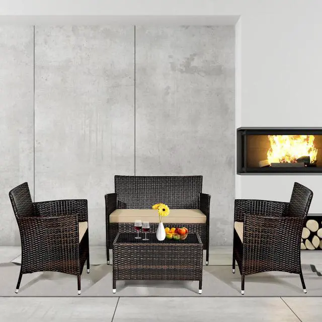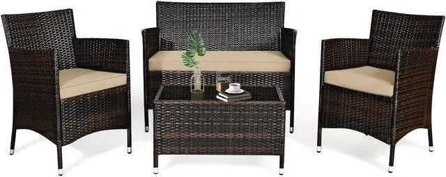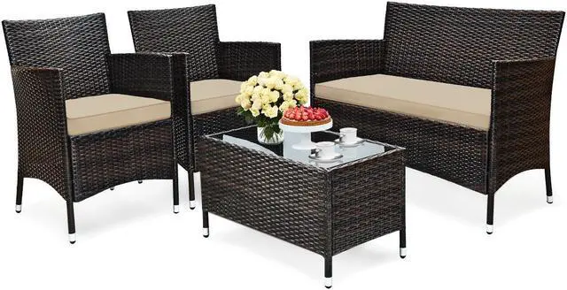SlickBlue 4 Pieces Comfortable Outdoor Rattan Sofa Set with Glass Coffee Table