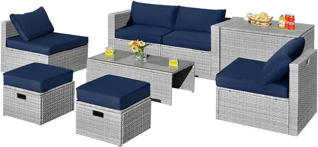-Package includes: 1 x Table, 1 x Storage box, 1 x Waterproof cover, 2 x Ottomans, 2 x Corner sofas, 2 x Armless sofas, 2 x Ottoman cushions, 4 x Back cushions, 4 x Seat cushions, 1 x Instruction
