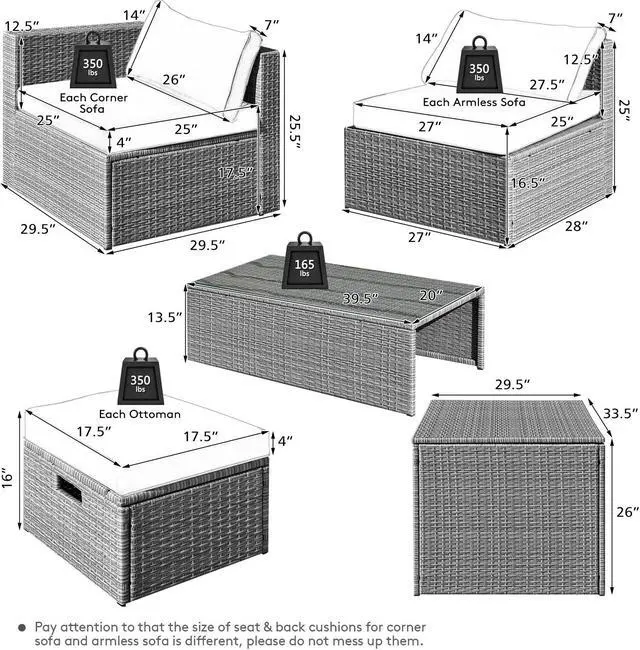 Product Information: The full set comes in 4 separate packages, which might not arrive on the same day. Overall dimension of table: 39.5" x 20" x 13.5" (L x W x H), overall dimension of storage box: 33.5" x 29.5" x 26" (L x W x H), overall dimension of each ottoman: 17.5" x 17.5" x 16" (L x W x H), overall dimension of each corner sofa: 29.5" x 29.5" x 25.5" (L x W x H), overall dimension of each armless sofa: 28" x 27" x 25" (L x W x H).